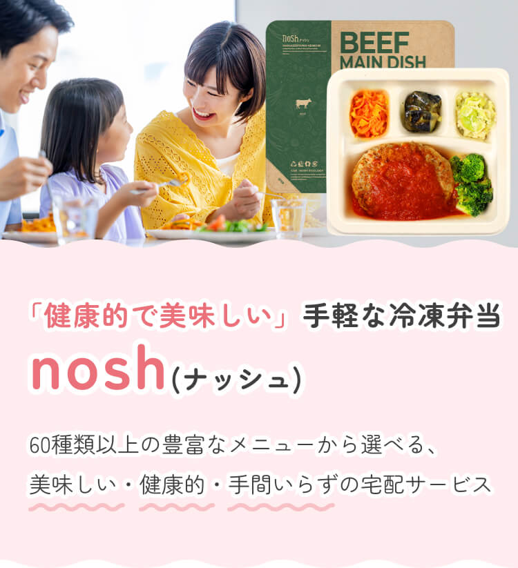 お仕事で疲れた分、お家では少しでもゆっくり休める時間が欲しいと思います。noshはそんな保護者様の味方だと思います。お家に帰ってお腹が空いたと言っているお子さんにレンジで温めるだけですぐに出せるご飯でだいぶ家事の負担も減ると思います。なかなかお野菜を食べてくれないと困っているご家庭もnoshの豊富なメニューの中から、お子さんが食べてくれるものを見つけ、それを真似て今後調理してみるのも良さそうですよね。